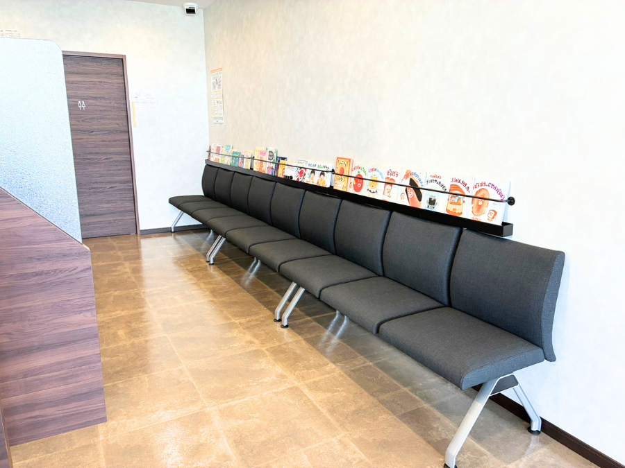 西の原店の特長の一つが、落ち着きのあるやさしい空間づくりです。店内はシックで清潔感のある色調でまとめられ、ゆったりと座れる待合スペースを確保。お子さま向けの絵本をはじめ、雑誌類も充実しており、どの世代の方にも心地よくお過ごしいただけるよう工夫しています。