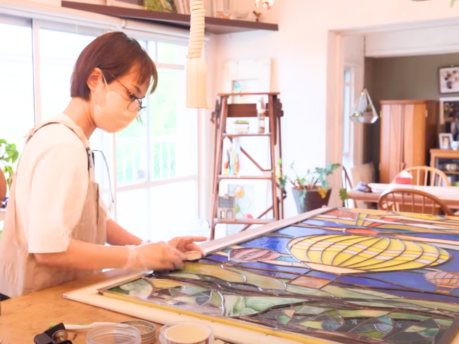 今回の動画では、細やかな手作業でガラスを組み合わせる姿、光の入り方を確認しながら色のバランスを整える真摯な表情、完成した作品が薬局の待合室に設置される瞬間といった貴重なシーンが収められています。
